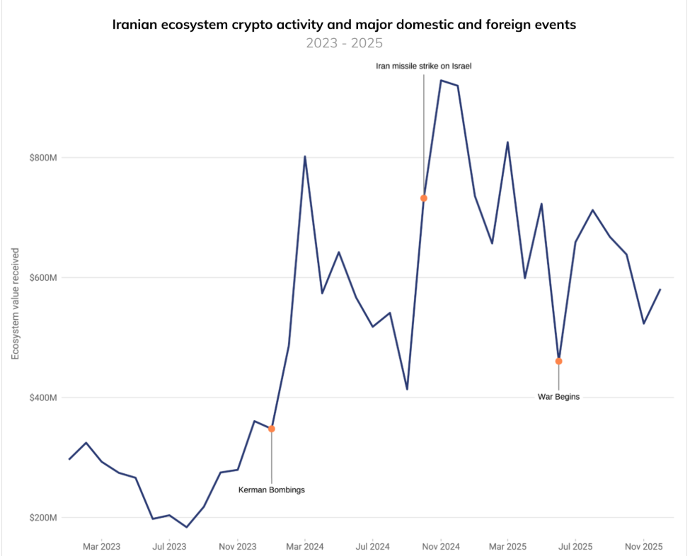 Исторический анализ Chainalysis подтверждает, что криптоактивность в Иране не является постоянной, а взрывается при геополитических потрясениях. Значительные пики были зафиксированы во время взрывов в Кермане в январе 2024 года, ракетных атак на Израиль в октябре того же года и совсем недавно - во время "12-дневной войны" в июне 2025 года. В ходе последнего конфликта были совершены целенаправленные кибератаки на главный национальный банк страны и крупнейшую криптовалютную биржу Nobitex.