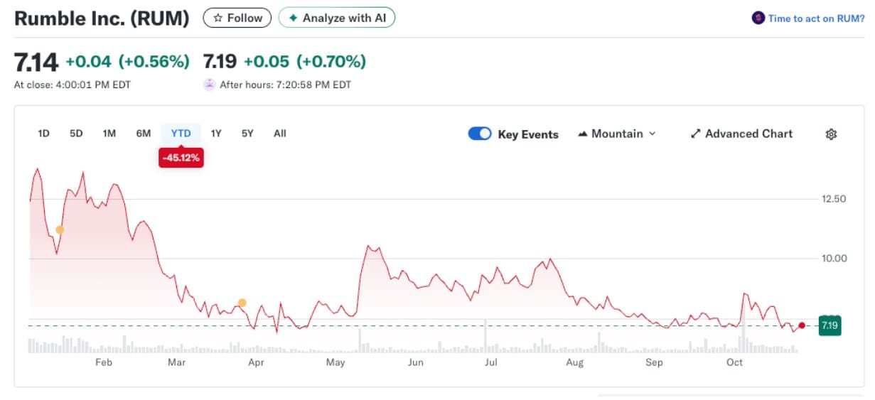 Акции Rumble (RUM) были проданы в пятницу по цене $7,14.